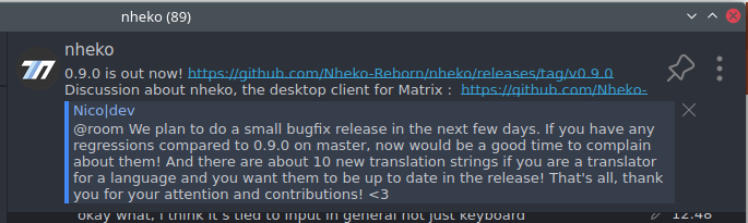 Some of the fixes this week include another crash fix for handling matrix links from your browser, notification bubbles that can show values over 9000(!), better preview images for sticker and emote packs created in Nheko, allowing you to click links in replies, a few layout and click area fixes. Nheko now also keeps track of your latest reactions and gives you easy access to them in the hover menu.